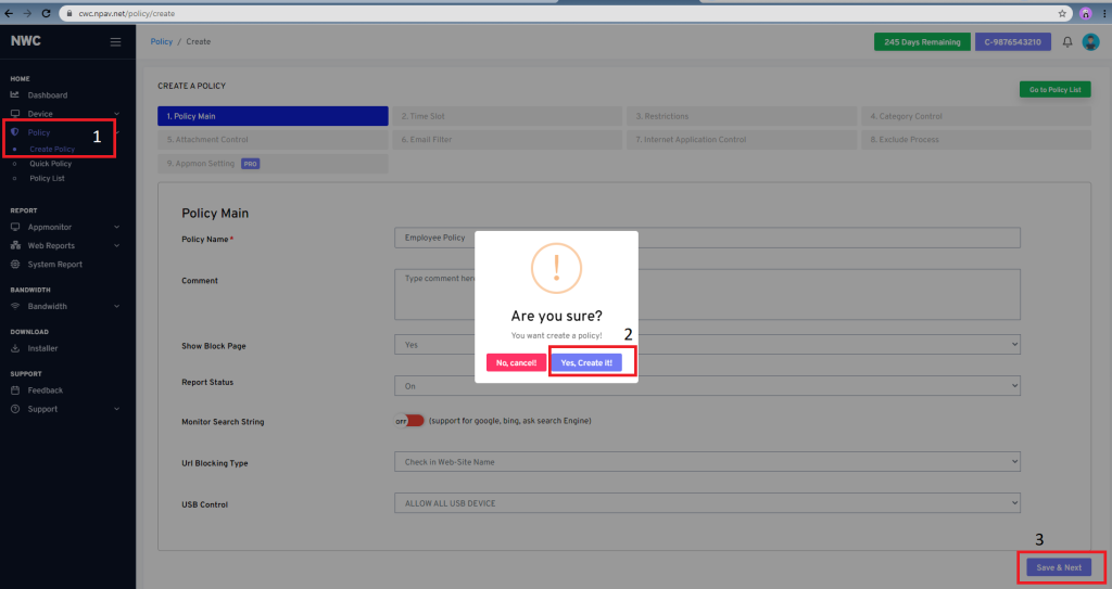 - Create Policy >>Enter policy name >> Save