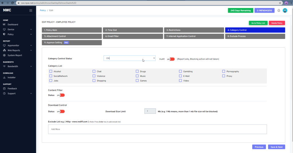 - OR Create Policy as Allow All & turn ON category control