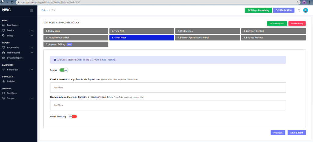 - Allowed / Blocked Email ID and ON / OFF Gmail Tracking
