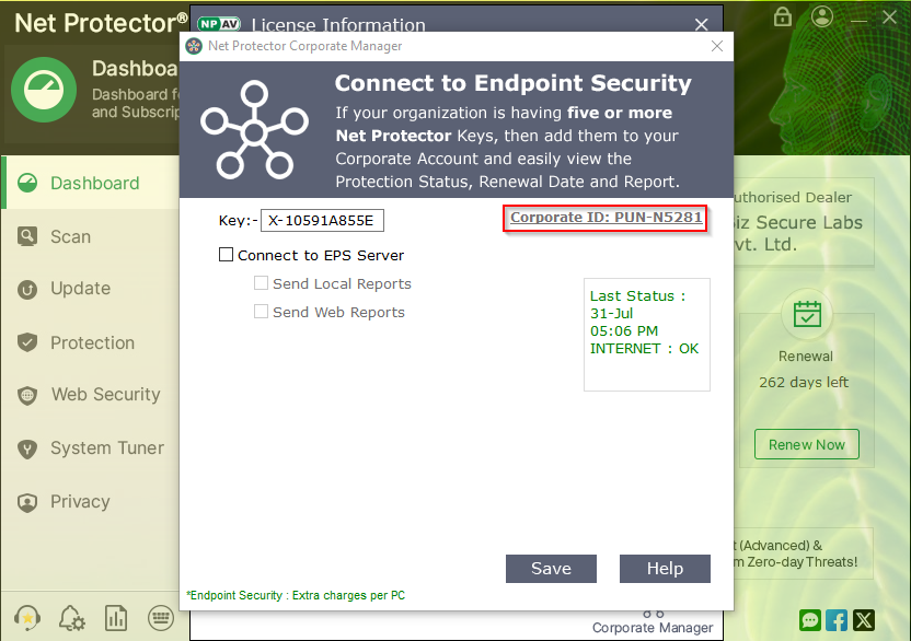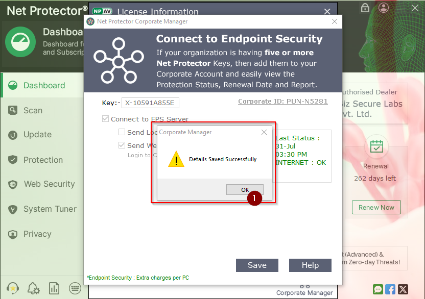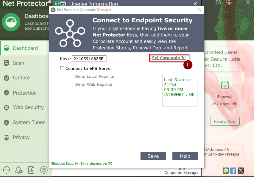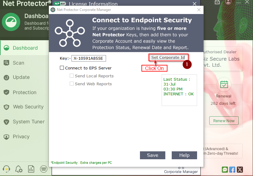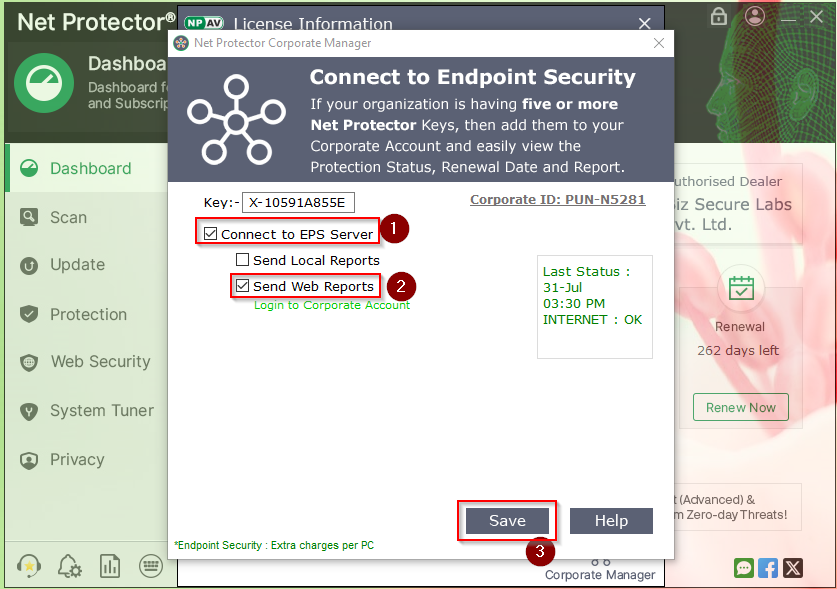Step 6: Once your corporate id has been set then you need to check two checkboxes of the 2nd stage to connect the client machine to EPS Server and click on the “Save” button.