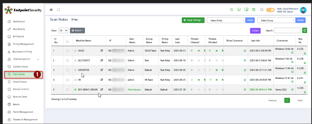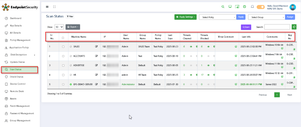 Step 3: Administrator can see the detailed report of each PC in network like Client IP, Machine Name, Last Scan, Threats Clean, Threats Blocked, Group Name as shown in below image