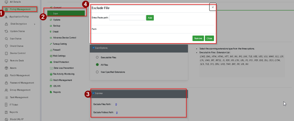Click on Scanner and select which files and folders that administrator want to exclude from scan.