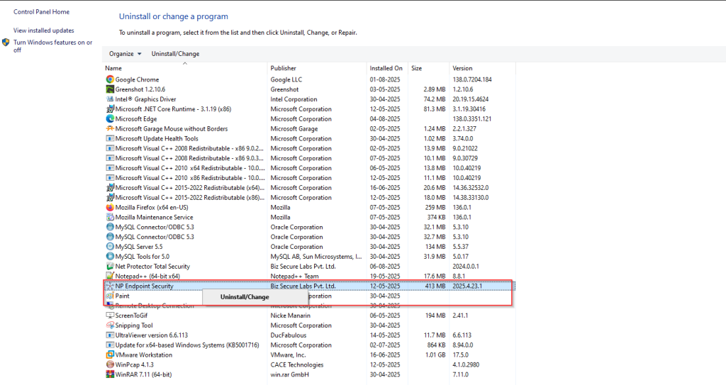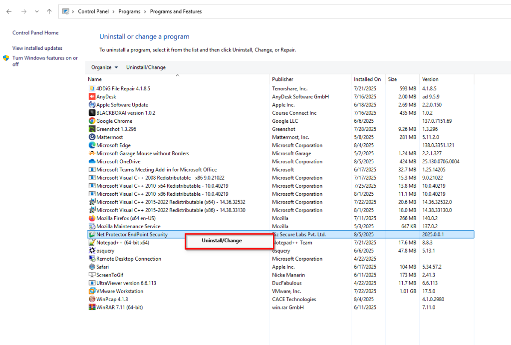 Step 6 : Right click on “Net Protector Endpoint Security” Click on “Uninstall”
