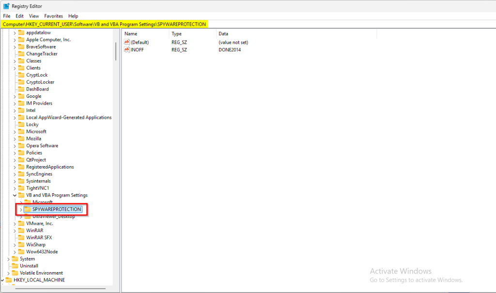 c. Computer\HKEY_CURRENT_USER\SOFTWARE\VB and VBA Program Settings\SPYWAREPROTECTION