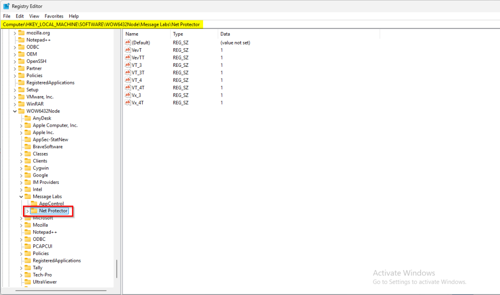 b. Computer\HKEY_LOCAL_MACHINE\SOFTWARE\WOW6432Node\Message Labs\Net Protector (For 64bit)