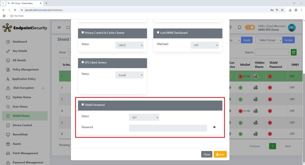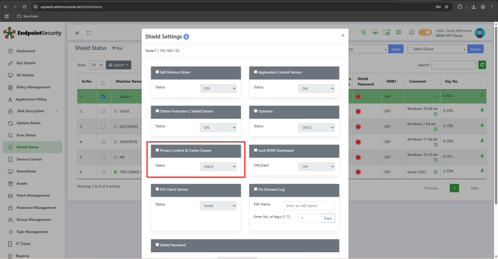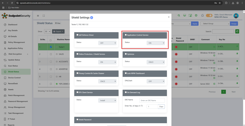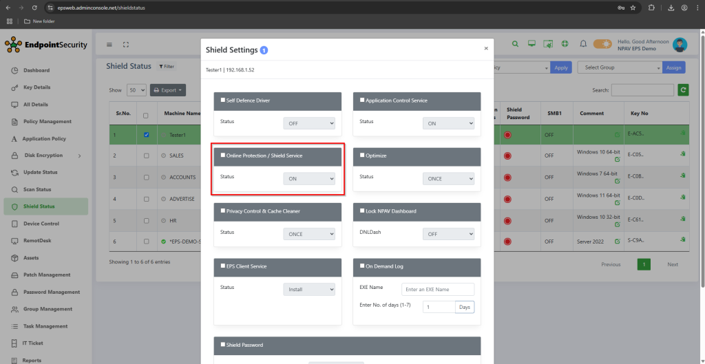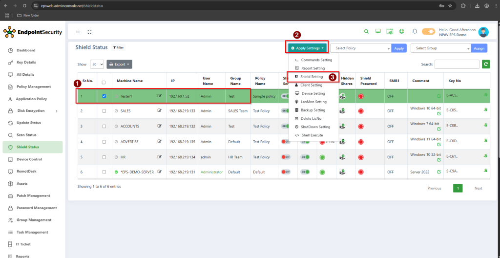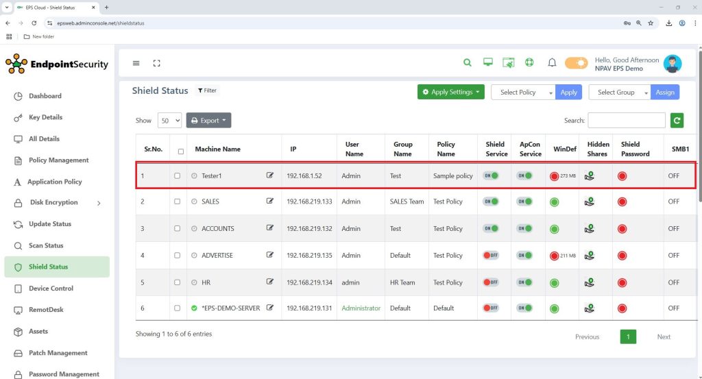 Admin Can View IP, Machine Name, User Name, Group Name, Shield Service, ApCon Service, USB Status and Hidden Shares of every machine.