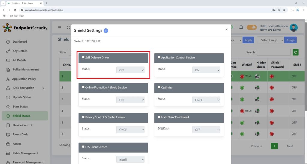 Self Defence Driver is used to Defend NPAV files and Folders being modified by unauthorized users. Admin can give settings to ON and OFF the setting from here.