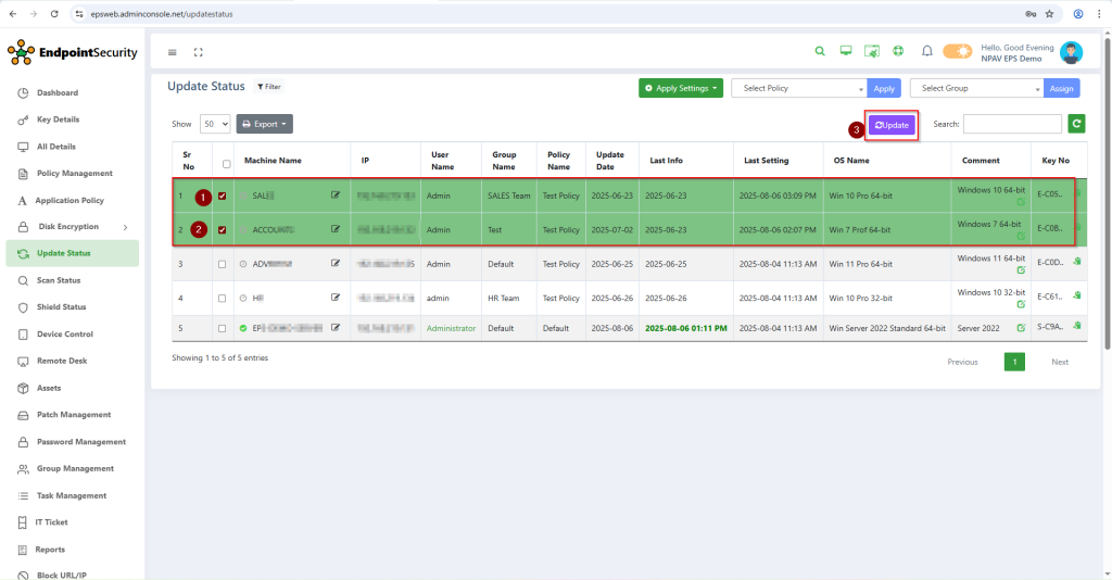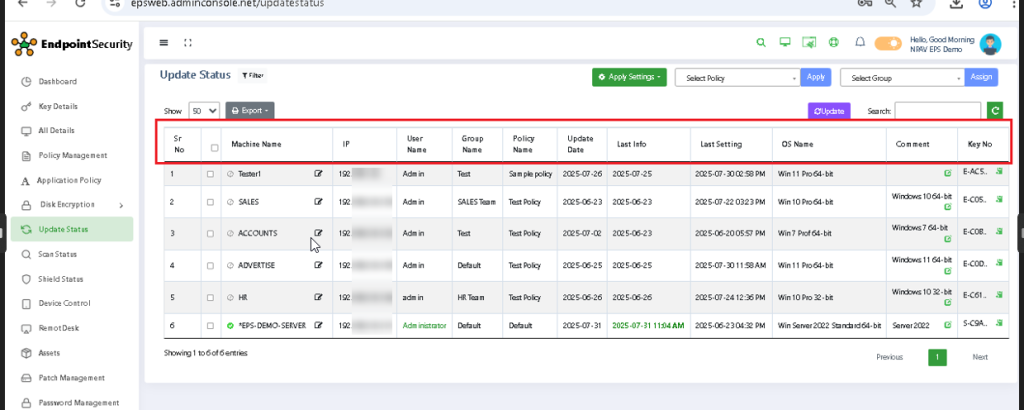 Step 4: Admin can view Key No, IP, Machine Name, User Name, Group Name, OS Name, Update Date, Last Info and so on.