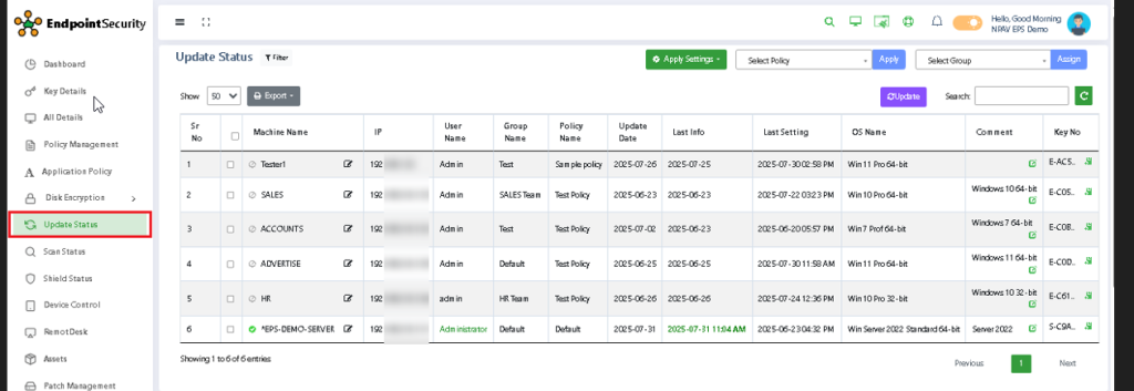 Update Status is useful to Admin because this will give the brief information about how many machines are updated and which machines still not updated to current date.