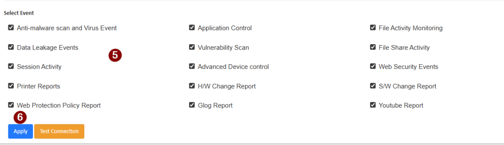 Select the Events for which you require logging to Syslog :