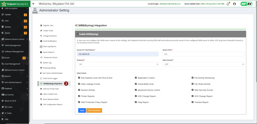Security Information and Event Management (SIEM) technology gathers information about security alerts generated by network hardware and software components. This will help to push all the event logs from the EPS server to the syslog server. This enables systems and applications to send log messages to a centralized syslog server for streamlined management, analysis, and monitoring. By integrating Syslog, organizations can consolidate logs from multiple sources, gain insights into system events, troubleshoot issues efficiently, and enhance security posture through comprehensive log management and analysis.