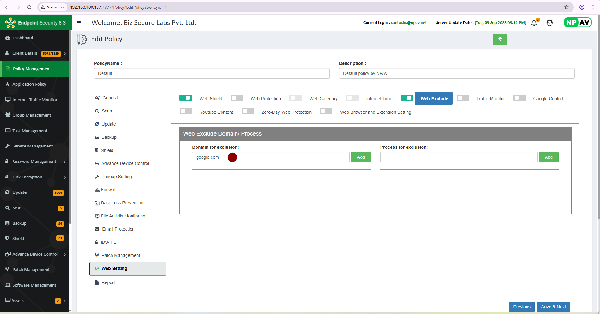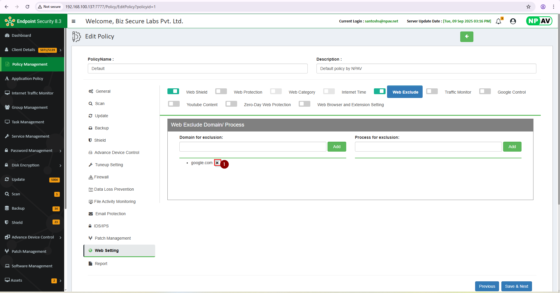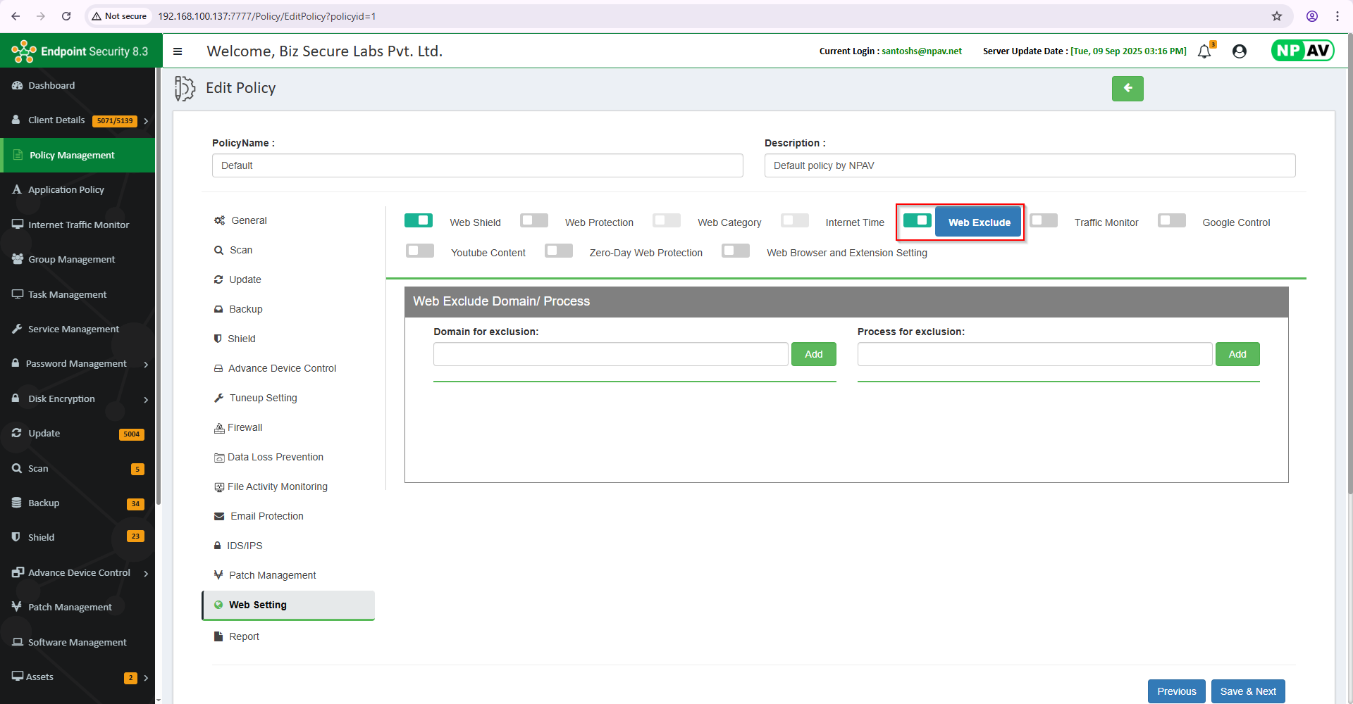 The Web Exclude Domain/Process feature allows administrators to specify certain domains, URLs, or processes that should be excluded from blocking or filtering rules. This is commonly used in security and web content management systems to ensure that trusted or necessary domains are not mistakenly blocked, or that certain processes are not interrupted by security scans or policies.