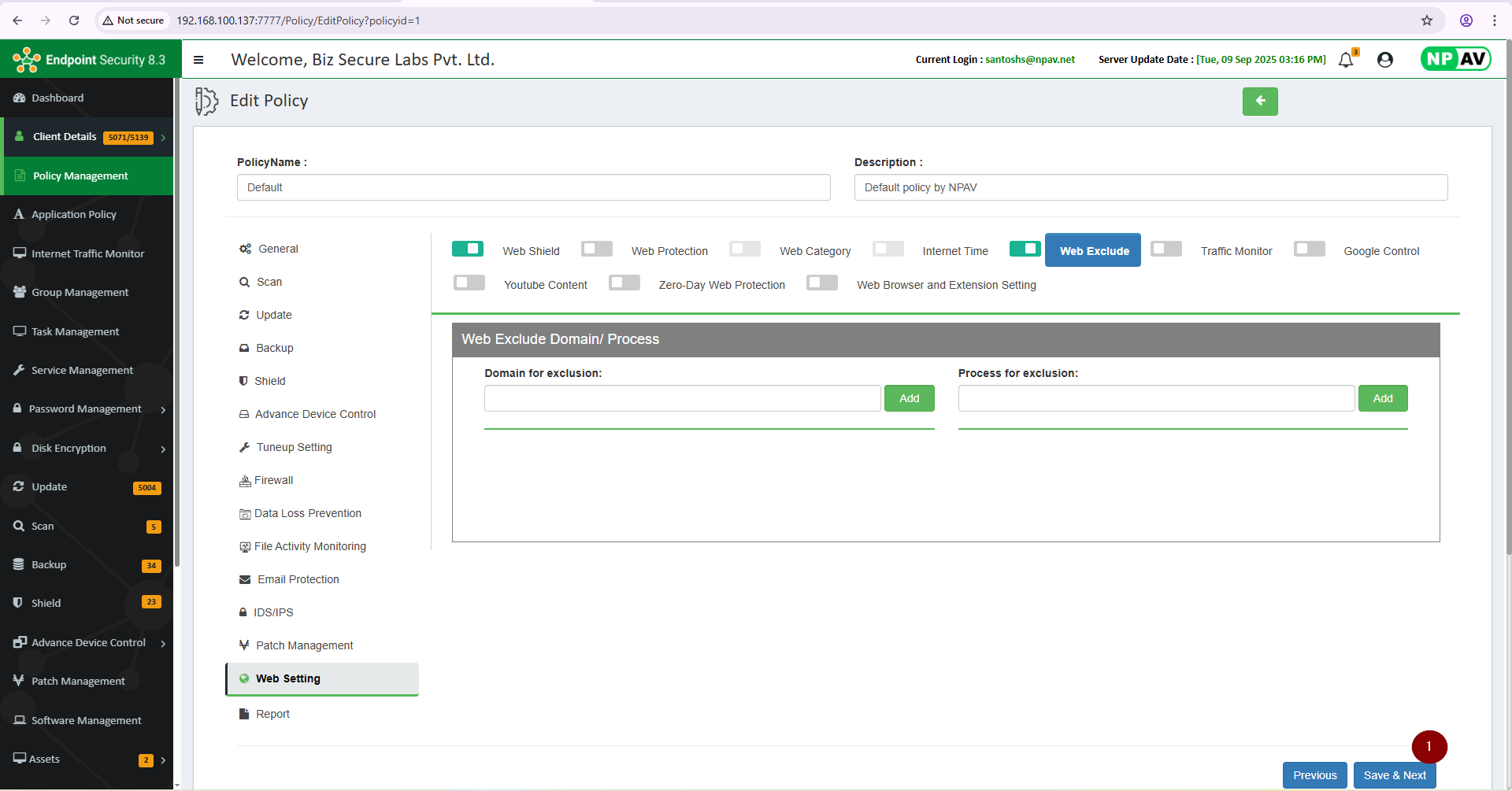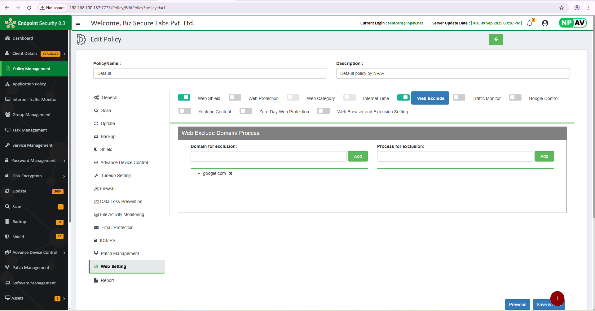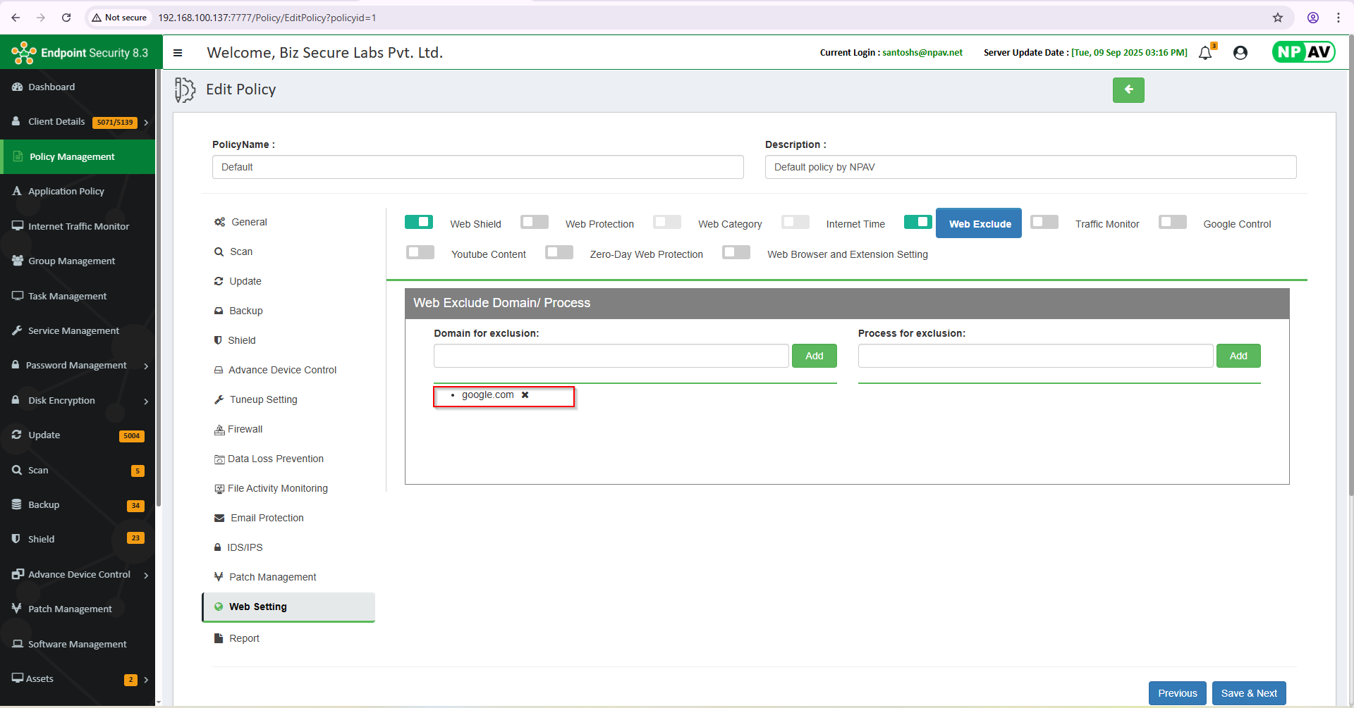 The Web Exclude Domain/Process feature allows administrators to specify certain domains, URLs, or processes that should be excluded from blocking or filtering rules. This is commonly used in security and web content management systems to ensure that trusted or necessary domains are not mistakenly blocked, or that certain processes are not interrupted by security scans or policies.
