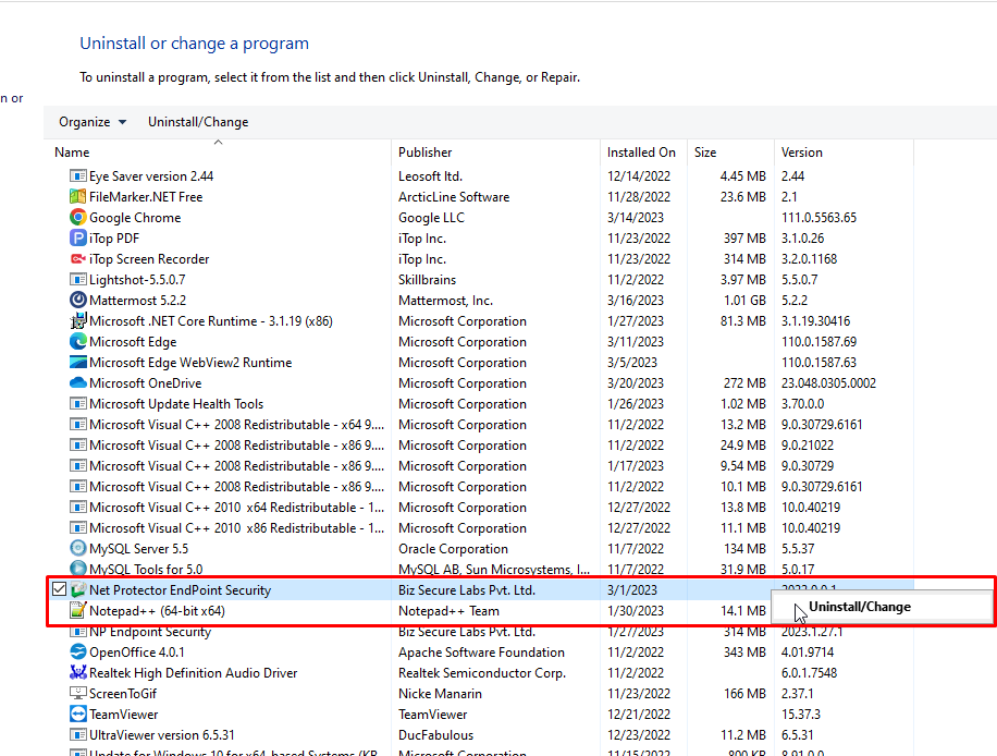 Steps 2: Right click on “Net Protector Endpoint Security” Click on “Uninstall”