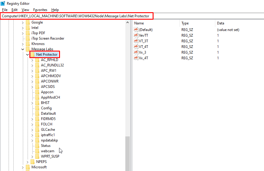 b. Computer\HKEY_LOCAL_MACHINE\SOFTWARE\WOW6432Node\Message Labs\Net Protector (For 64bit)