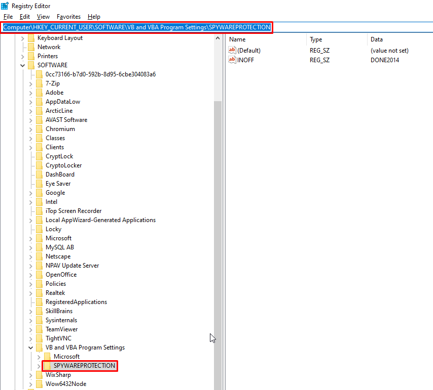 c. Computer\HKEY_CURRENT_USER\SOFTWARE\VB and VBA Program Settings\SPYWAREPROTECTION.
