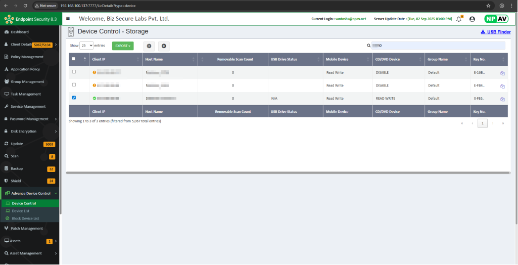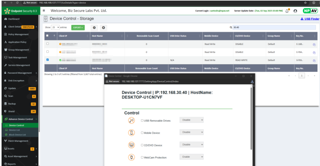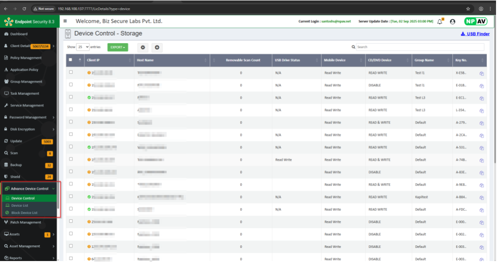 Administrator can see the detailed report of each PC in network . Report contains Client IP, Host Name, Removable Scan Count, USB Drive Status, Group Name, Mobile Device Status.