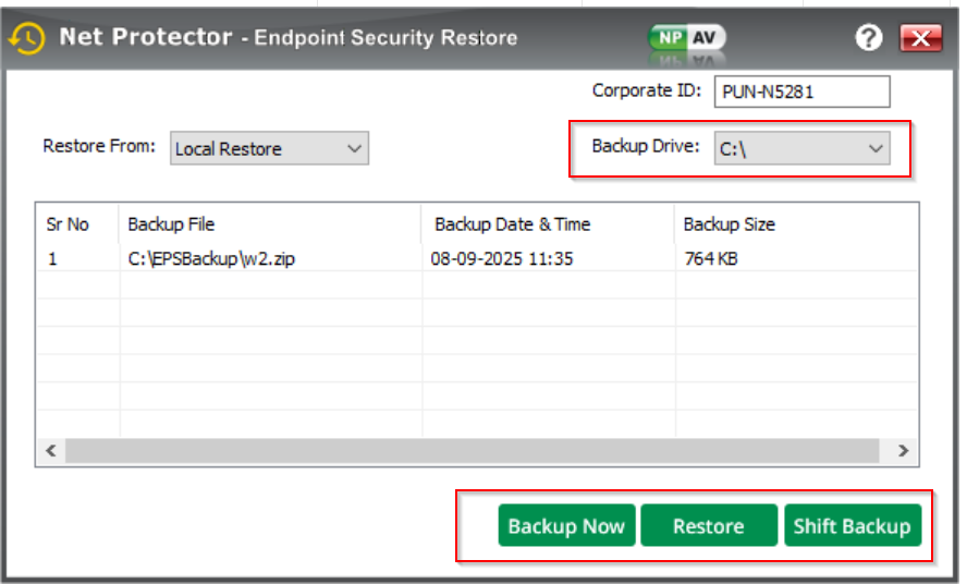 Drive wise taking backup with it’s path , date & time also with size shown.