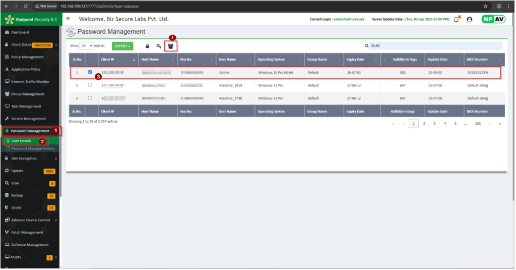 User Details , details about client ip , hostname , key no. , user name , os, group name , expiry date , validity of days , update date are shown
