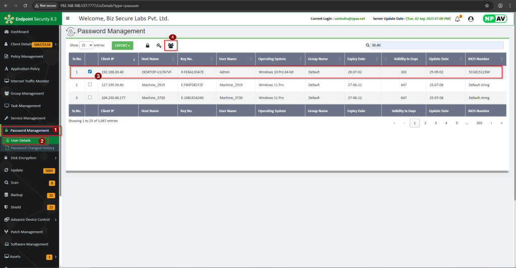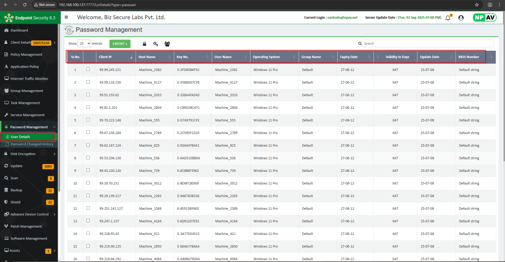 User Details , details about client ip , hostname , key no. , user name , os, group name , expiry date , validity of days , update date are shown