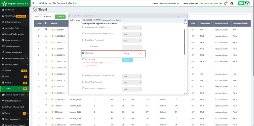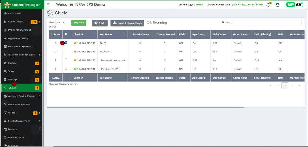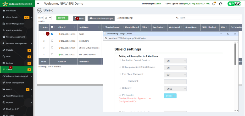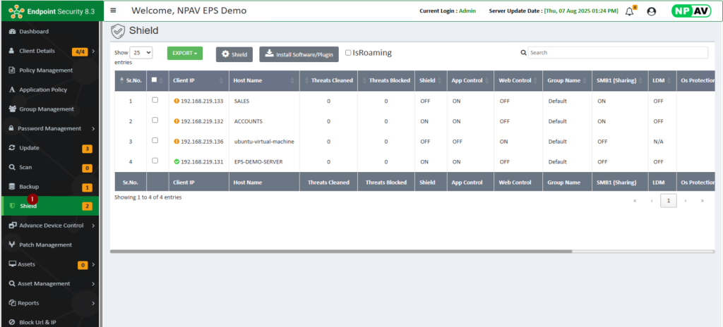 Administrator can see the detail reports of each PC in network like Client IP, Host Name, Threats Count, Threats Blocked, Shield status, App Control status, etc.