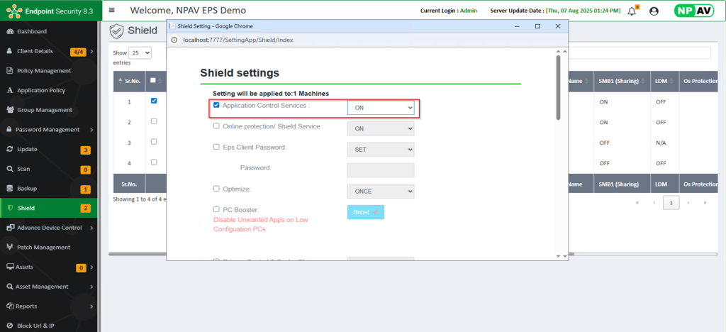 For applying Application Control setting to any client machine, select the client machine first and click on Application Control Setting’s check box, and give the setting for ON and OFF.
