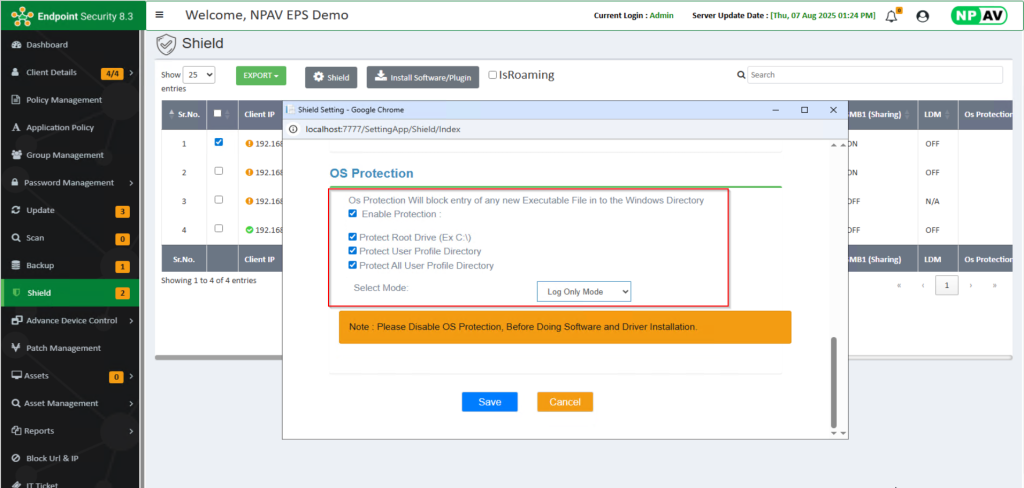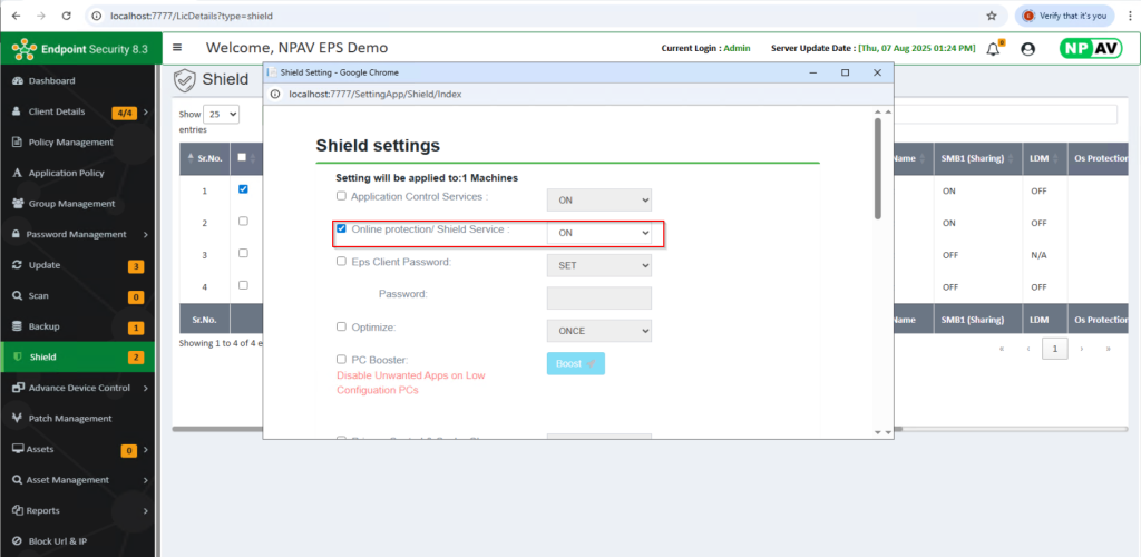 If you want to activate the Online protection or Shield Service to client machine then Select Online Protection check box and Click on ON/OFF as per your requirement.