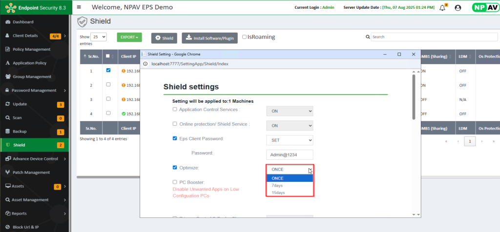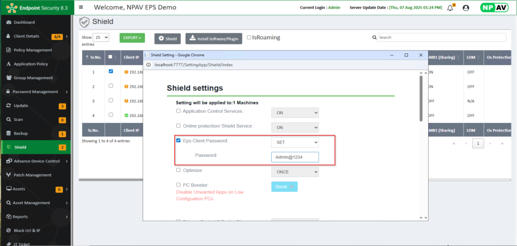 Shield of Admin Console is useful to give command related to protection of PCs from running any executable from External Media, Privacy Control and Online Protection.