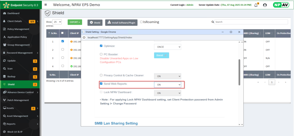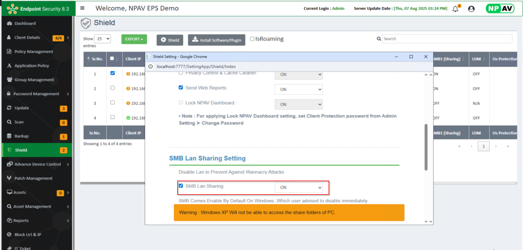 To protect the client machine from Wannacry virus or viruses which come through LAN, SMB setting should be enable. To enable setting, select S button given on the bottom of dashboard and give settings ON or OFF.