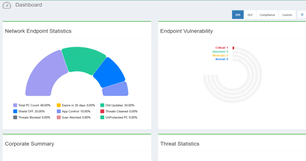• Graphical Dashboards: Utilizes intuitive charts and graphs for real-time visualization of network endpoint statistics, security health status, client updates, and threat status. This includes a clear representation of protected and unprotected client PCs.