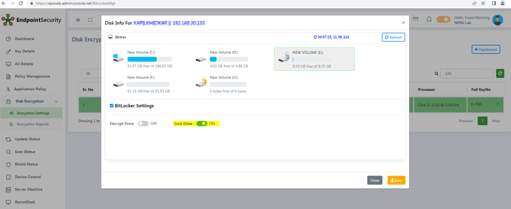 - Select the encrypted drive and bitlocker setting checkbox