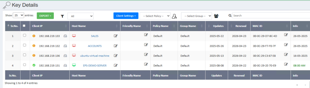 The Key Details section provides administrators with comprehensive information about client machines, including Key Number, IP Address, Host Name, and MAC ID. From this section, administrators can also apply Command Settings, Client Configuration Settings, and Top-up Settings.