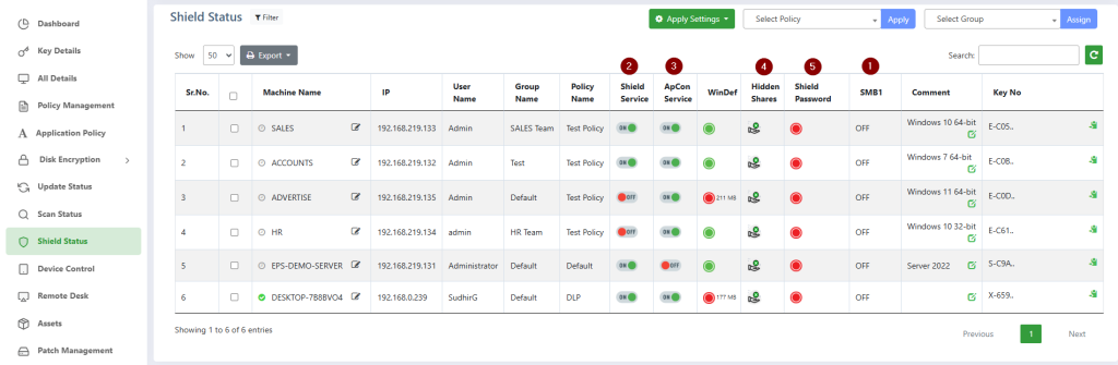 The Shield Status section provides a comprehensive overview of security-related services and configurations crucial for protecting endpoints from potential vulnerabilities. It comprises the following key components: