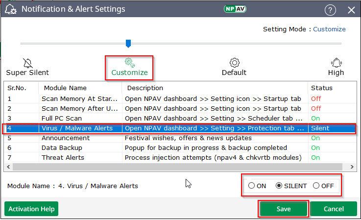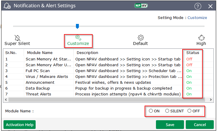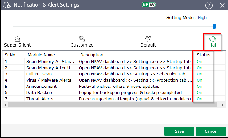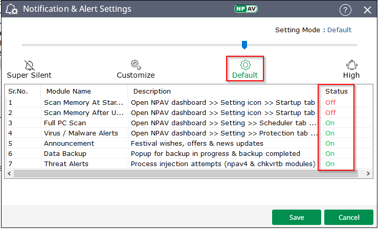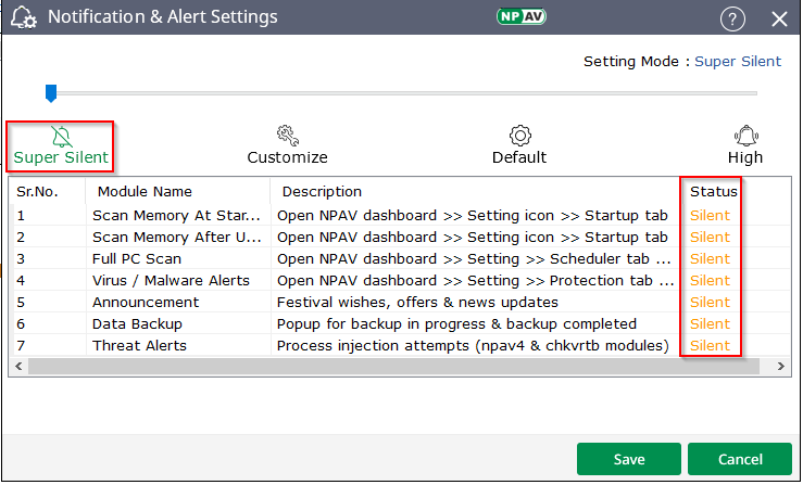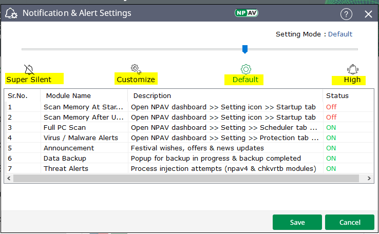 In this mode, notifications related to all the modules of NPAV will be given to the users.