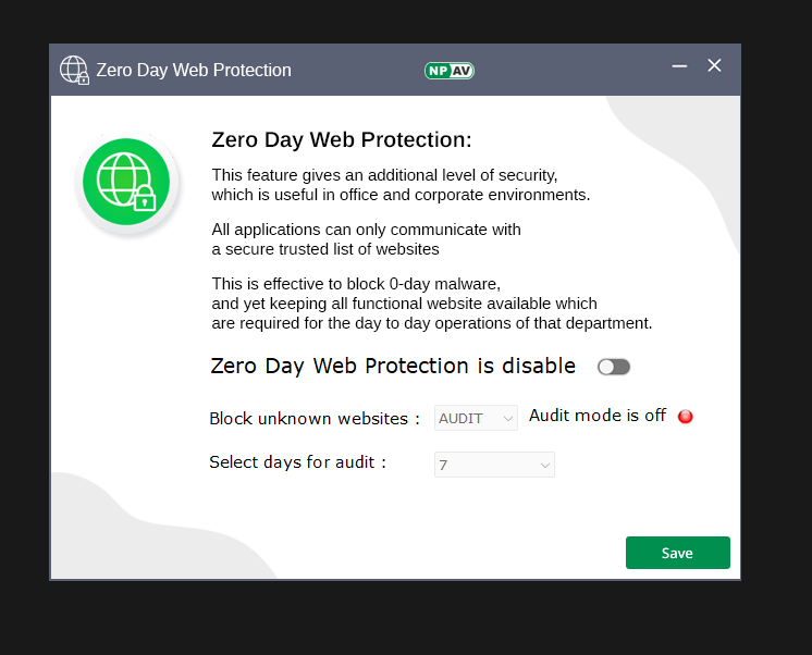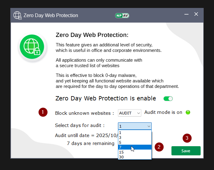 6.Enable the Zero Day Web Protection Toggle and Select “AUDIT” Mode to Allow the All Domains.