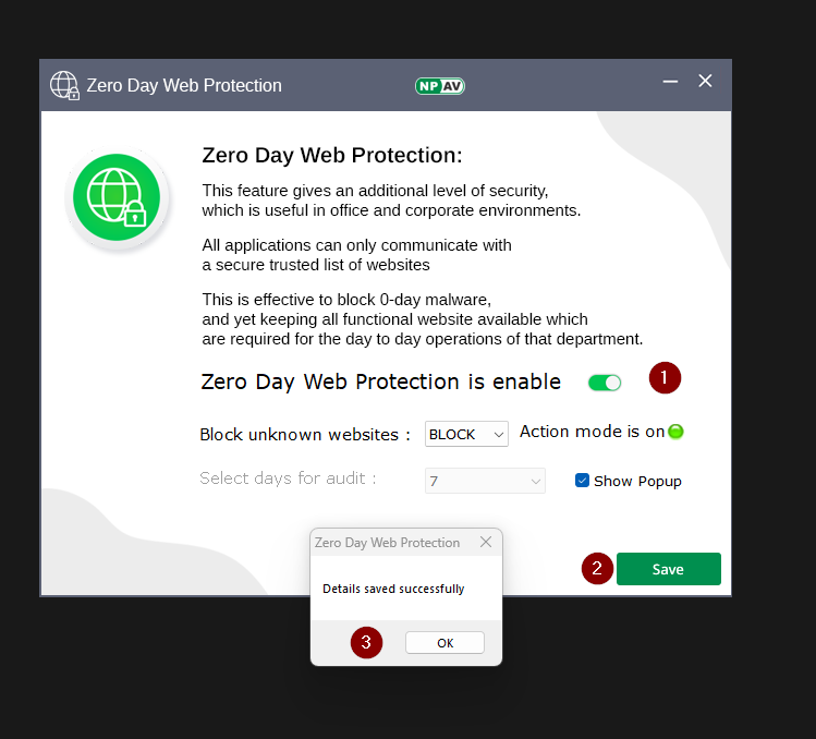 5.Enable the Zero Day Web Protection Toggle and Select “BLOCK” Mode to Block the Non-Trusted/Bad Domain