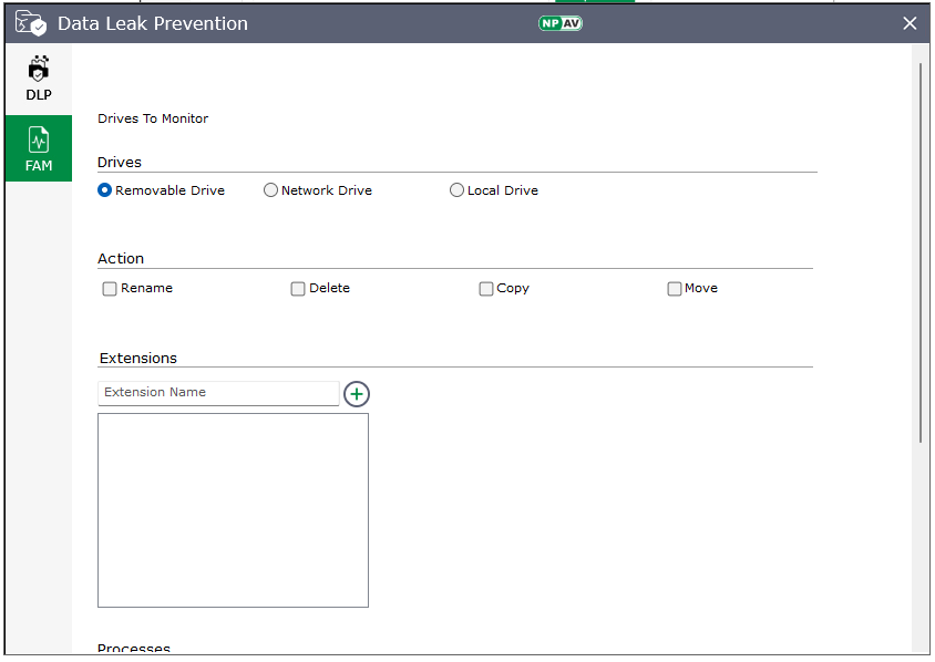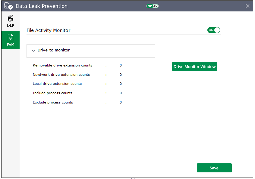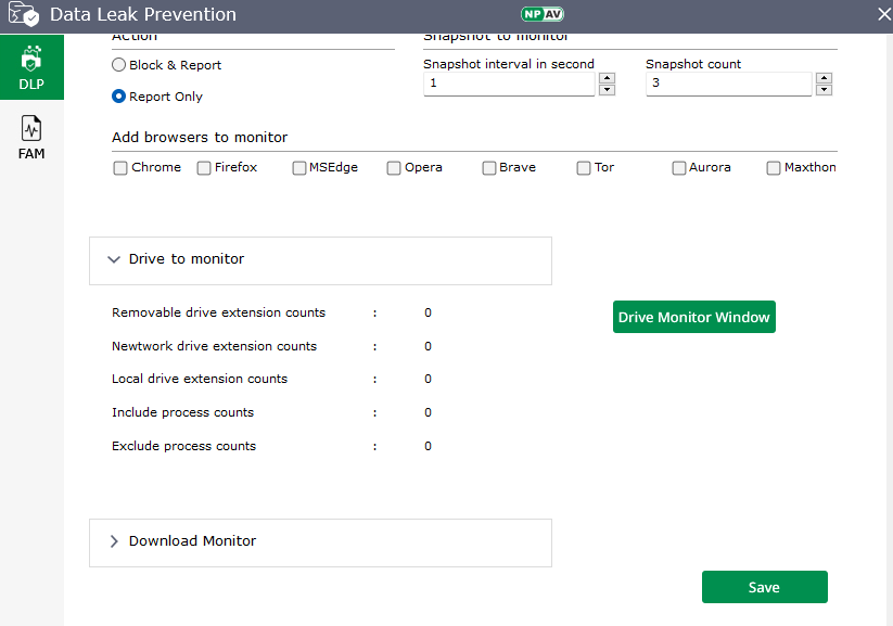 Drive to Monitor (expandable)Configure monitoring of specific drives for unauthorized data movement.Enable for external/removable drives.