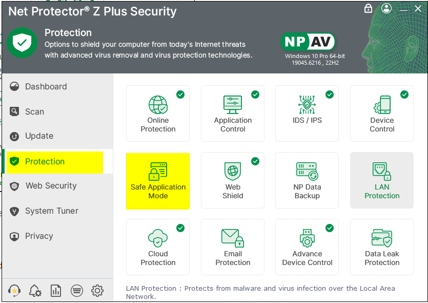 -Safe Application Mode in Net Protector is a security feature that blocks the installation and execution of new, unknown, or unwanted applications. It enhances security by preventing potentially harmful software from infiltrating your system, especially when it’s in a minimal or diagnostic state like Windows Safe Mode.