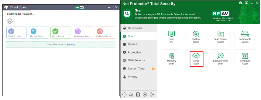 The Cloud Scan feature in Net Protector Antivirus (NPAV) is designed to analyze and safeguard your cloud-stored data against malware, ransomware, and other advanced threats. By leveraging cloud-based threat intelligence, it ensures real-time protection and accurate classification of your files.