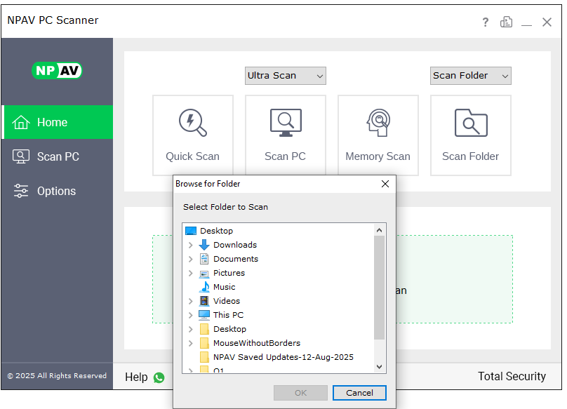 - After selecting the folder, click on the “OK” button to start the scanning process. NPAV will analyze all files within the chosen folder, including subfolders, for potential threats.