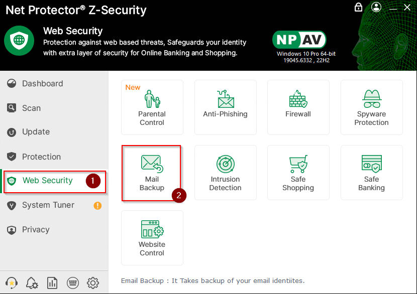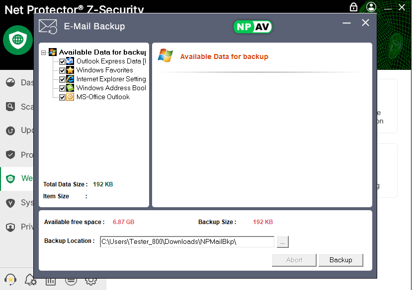 The E-Mail Backup feature in NPAV allows you to securely back up important mail and system-related data, including Microsoft Outlook and Outlook Express mailboxes. This ensures that your emails, contacts, and settings remain safe and can be restored whenever required.