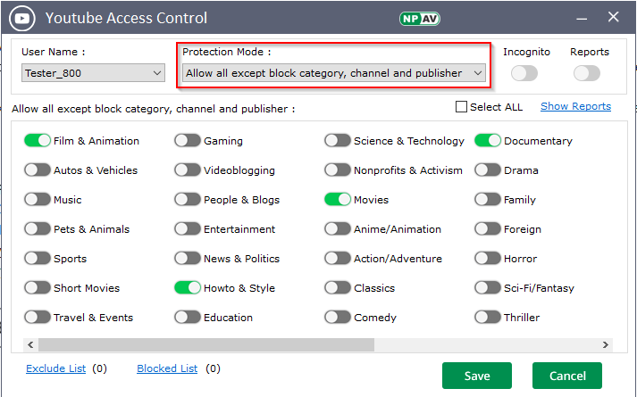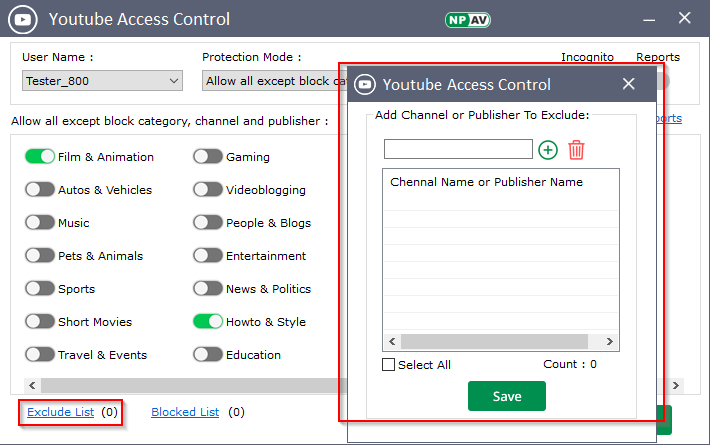 2. When the setting is “Allow all except block list,” you can use the “Exclude List” feature to permit specific channels from the blocked category.