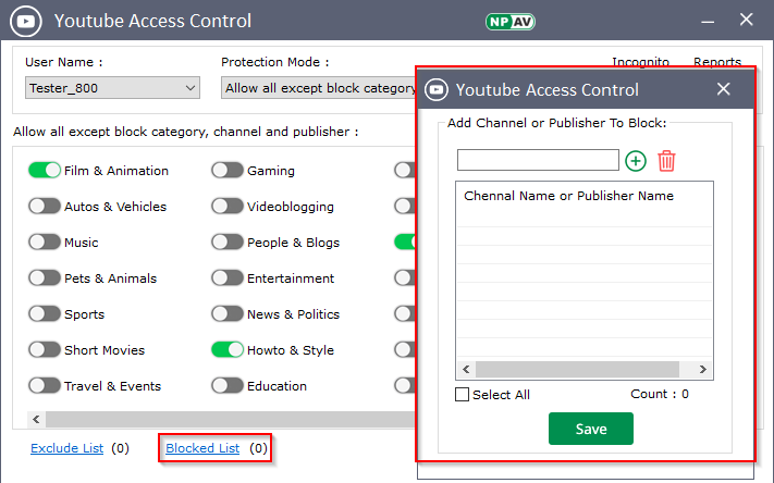 3. When the setting is “Allow all except block list,” you can enable “Block List” and publisher feature to block specific channels or publishers as needed. - Block All Except Allowlist