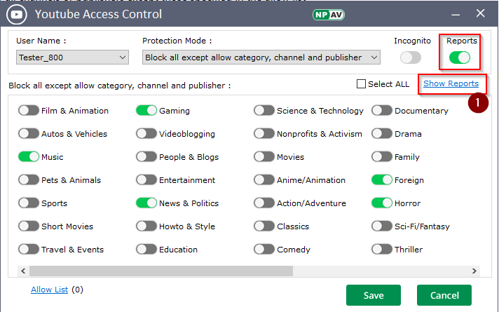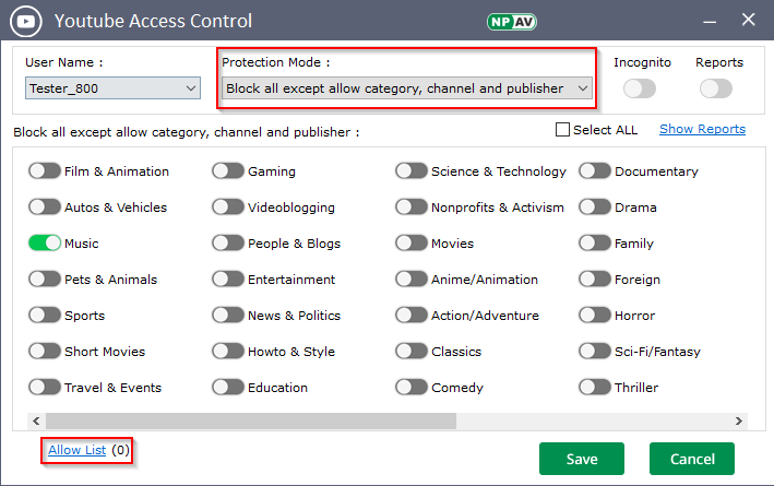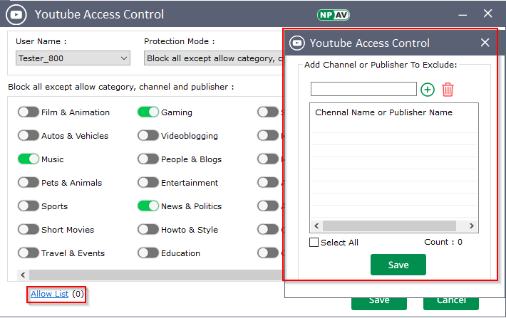3. When the setting is “Block all except allow list,” you can enable “Allow List” and publisher feature to allow specific channels or publishers as needed.