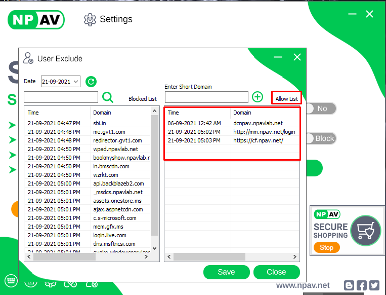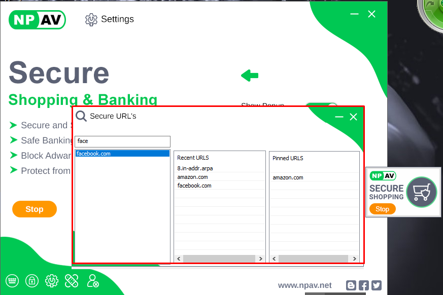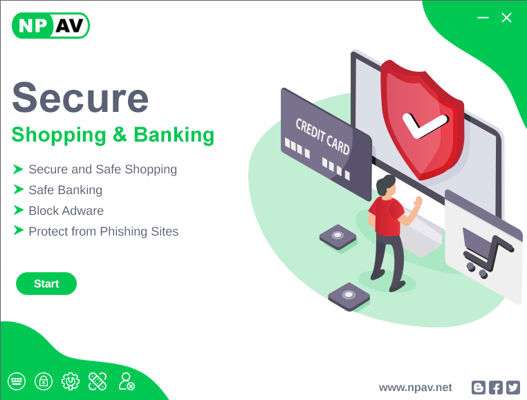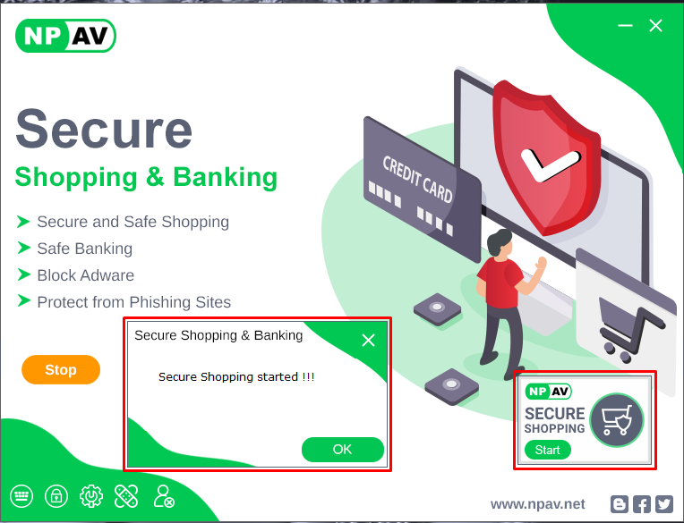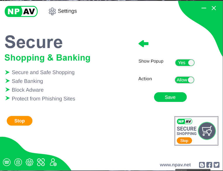 - It automatically blocks the communication to any third-party and fraudulent websites hosted by cyber-criminals and hackers, anyone can securely done banking transactions and shopping by using NPAV secure shopping and banking mode.