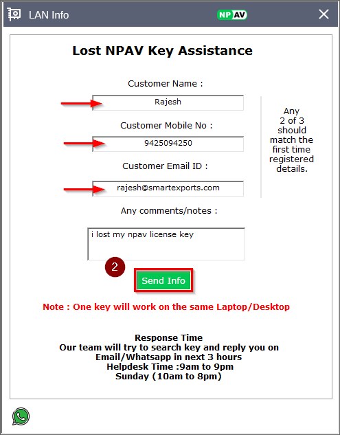 2. Fill Your Registered contact details on Lost Key assistance window and Click on  Send Info button.