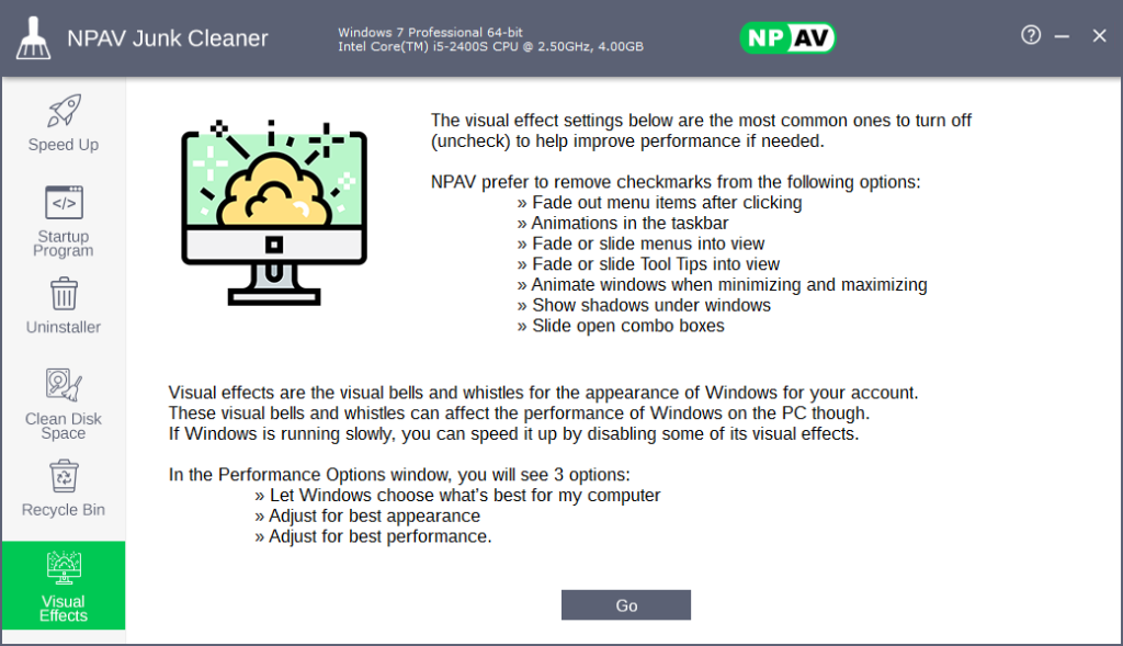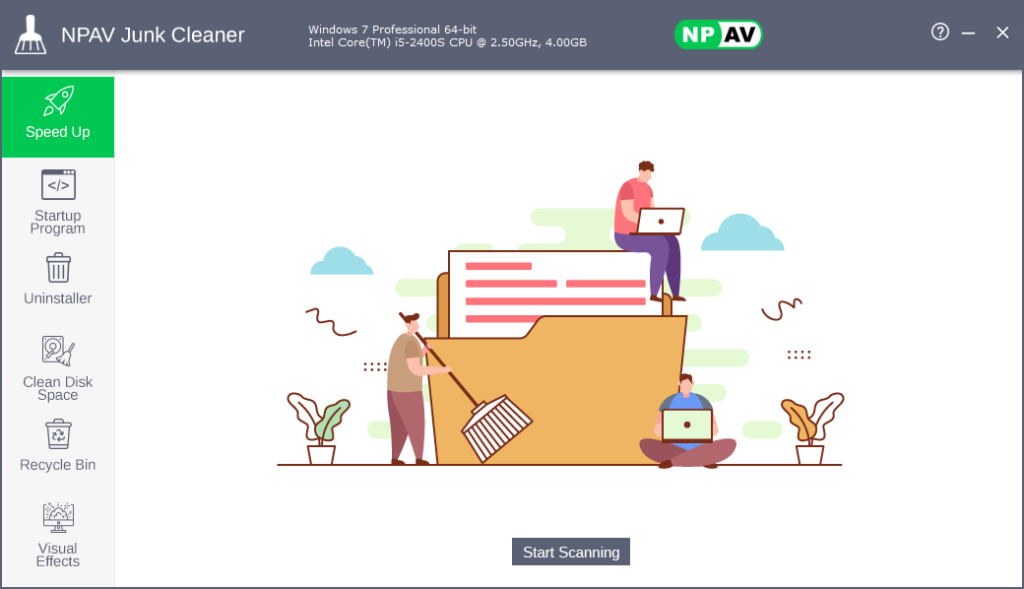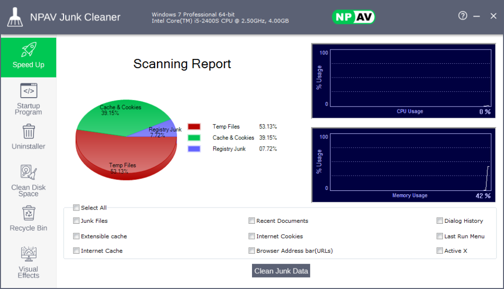 As the name suggests, Speed-Up can be used by users to analyze the entire system and find all junk and garbage files stored in the memory. The user gets a detailed report about the CPU and memory usage along with the option to delete selected categories of junk files.