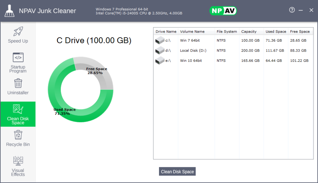 This module of junk cleaner is used to monitor and clear disk-wise space. Monitoring of used and total space is user-friendly and convenient. Defragmenting the disk reduces the launching time of applications.