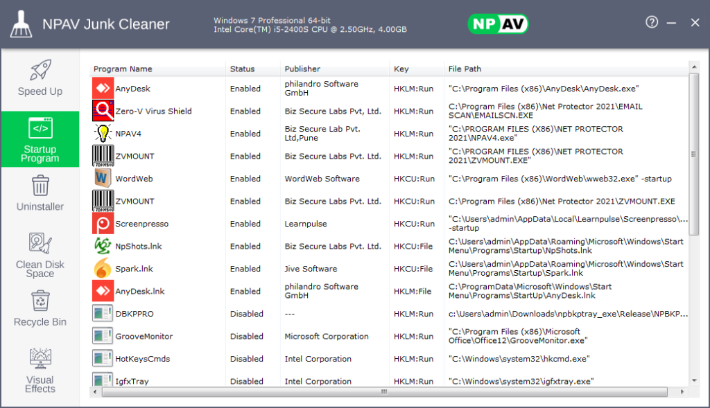 All the startup programs are listed under this section of the module. User can enable, disable, delete and open file location of the selected startup program.