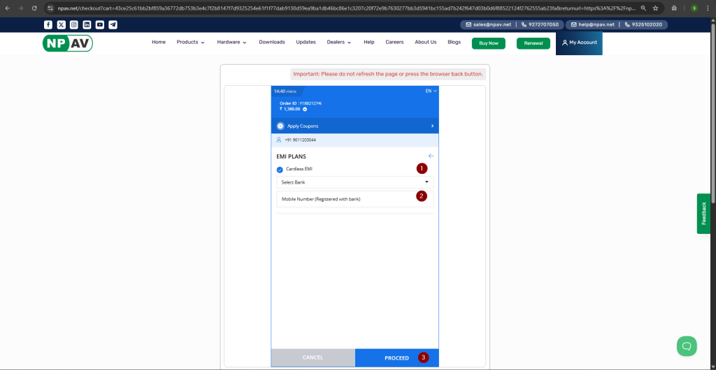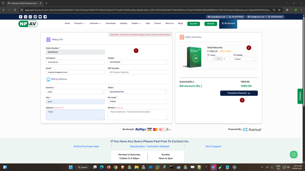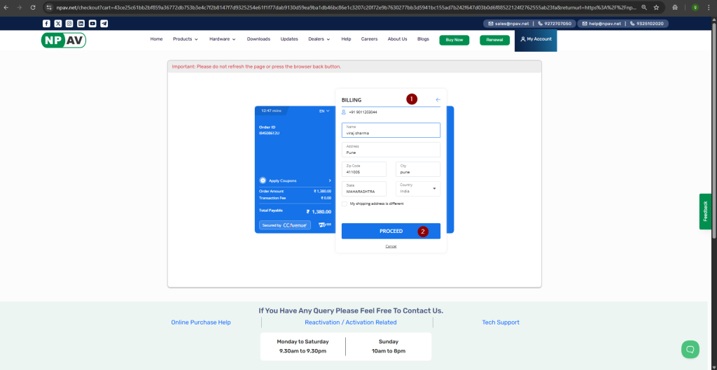Step 2 – Enter All Details Regarding Billing Info , Verify Selected Product With Mentioned Amount And Then Proceed For Payment